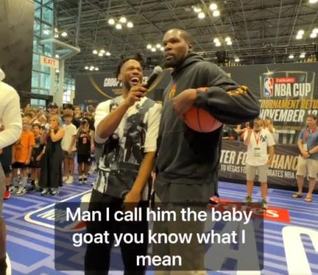 活动期间,杜兰特被要求谈一谈华子,KD说:“我叫他Baby-GOAT(greatest of all time),你懂我意思。”