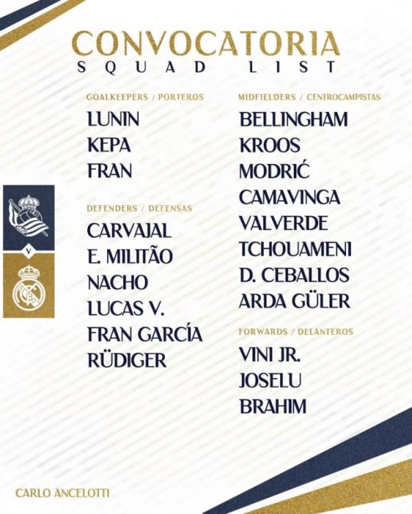 4月26日讯 4月27日03:00西甲第33轮,皇马客场对阵皇家社会。赛前,皇马更新比赛名单,罗德里戈因流感缺席,此前患上肠胃炎的贝林厄姆入选大名单。