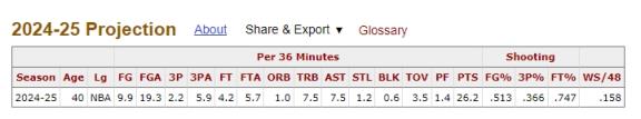 知名数据网站BBR预测詹姆斯新赛季数据: